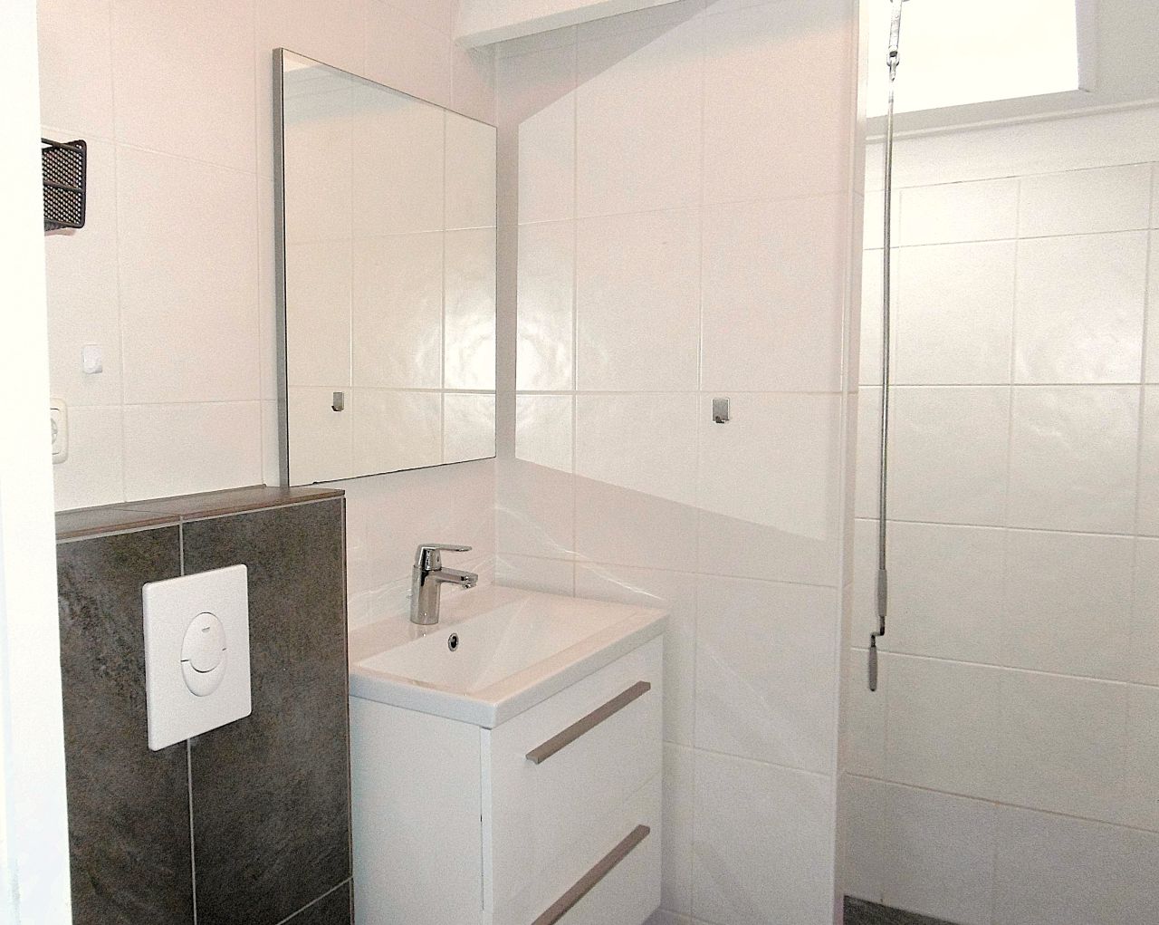 • Een splinternieuwe badkamer in antraciet/wit, met extra dakvenster voor daglicht en ventilatie.