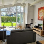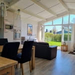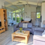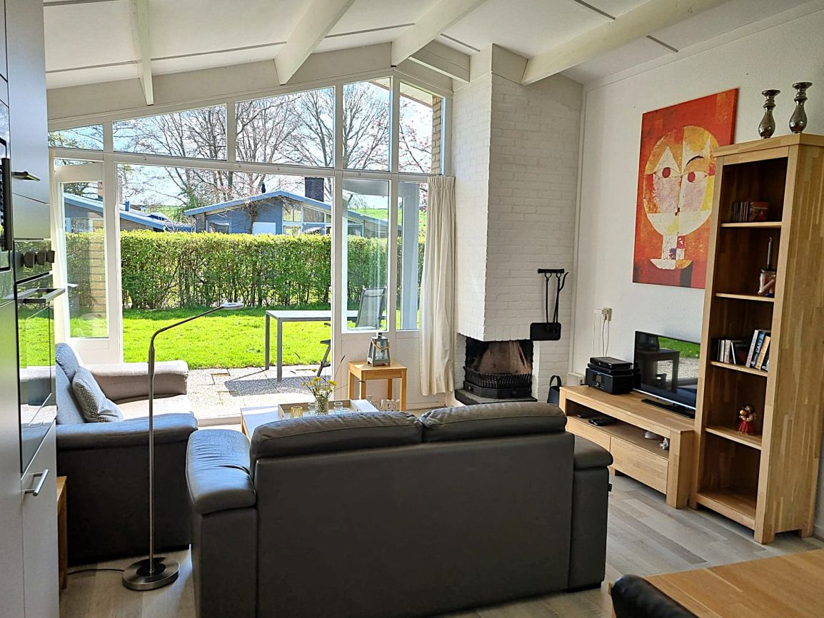 Bij binnenkomst wordt u direct verrast door de ruime, modern ingerichte woonkamer met open keuken. De lichte laminaatvloer, harmonieuze kleuren en smaakvolle meubels zorgen voor een warme en ontspannen sfeer. De gezellige zithoek met twee royale banken, een boekenkast, een praktische ladekast, een salontafel en een tv-/mediasysteem biedt optimaal comfort voor een aangenaam verblijf. De open haard zorgt op koelere dagen voor extra gezelligheid. Via de openslaande tuindeuren bereikt u direct de zonnige tuin – een prachtige uitbreiding van uw leefruimte.