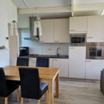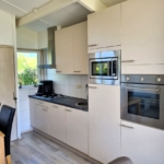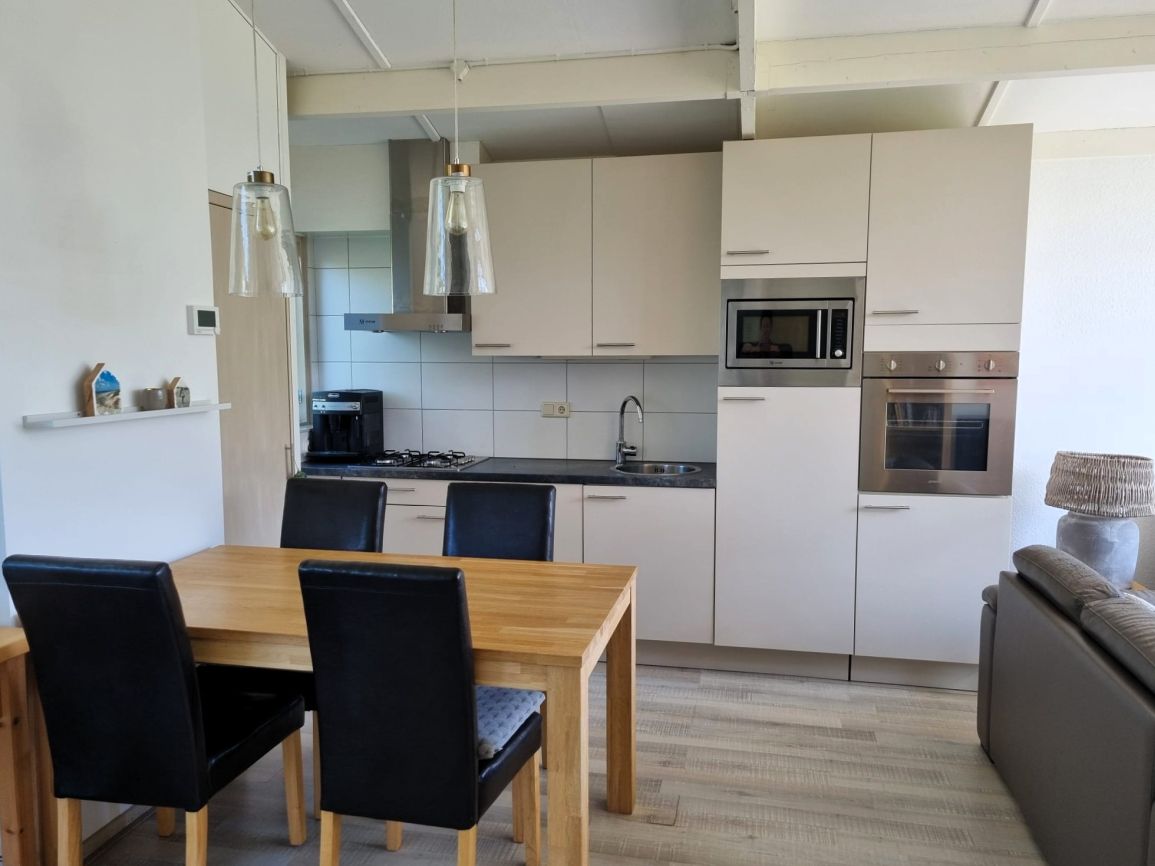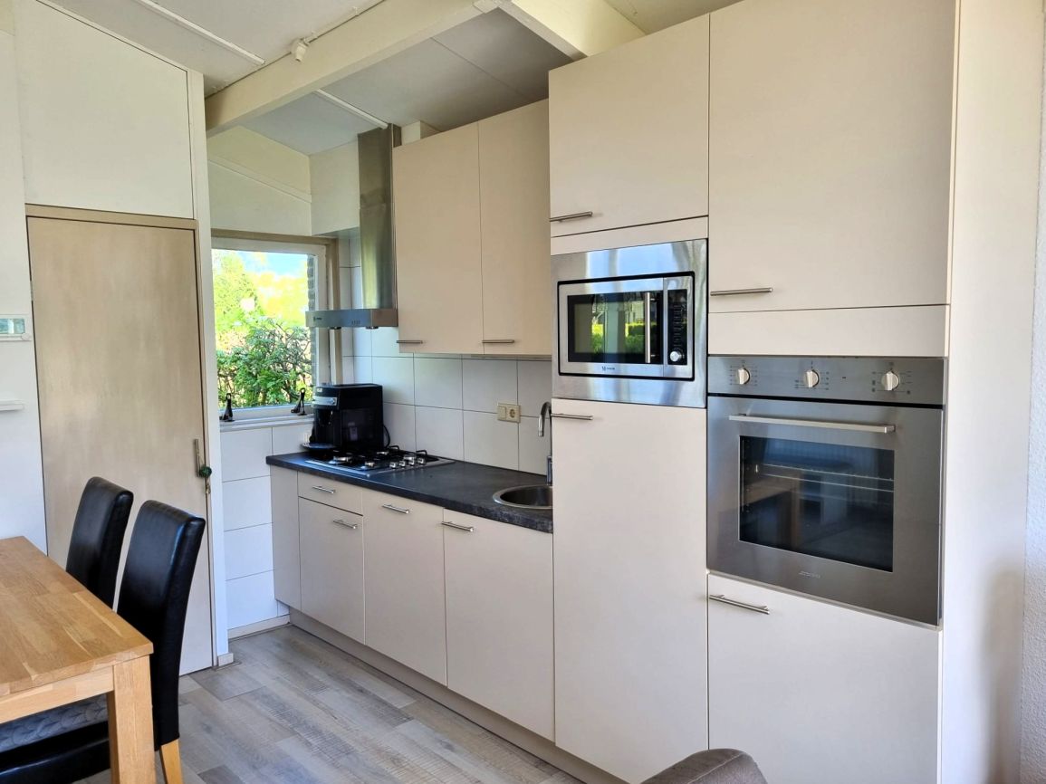De volledig uitgeruste keuken beschikt over alle benodigde inbouwapparatuur, waaronder een magnetron, oven, vaatwasser en een 4-pits gaskookplaat met roestvrijstalen afzuigkap en veel kastruimte. Uiteraard ontbreken praktische extra’s zoals een waterkoker en een broodrooster niet. De uitnodigende eethoek maakt het geheel compleet.