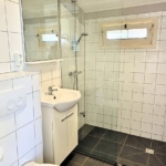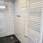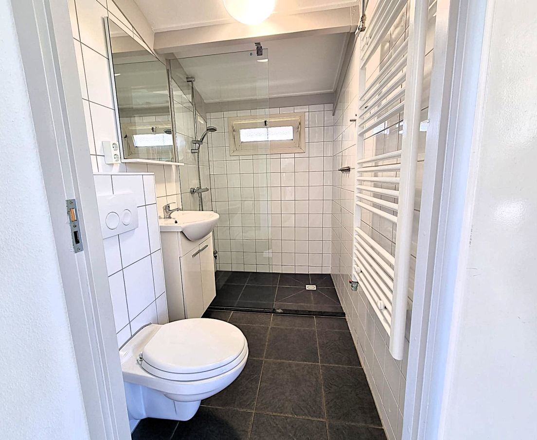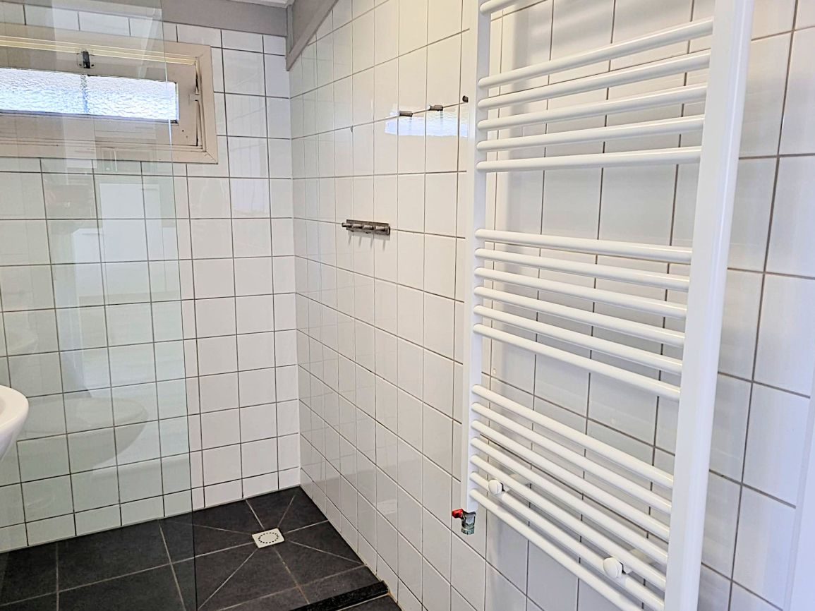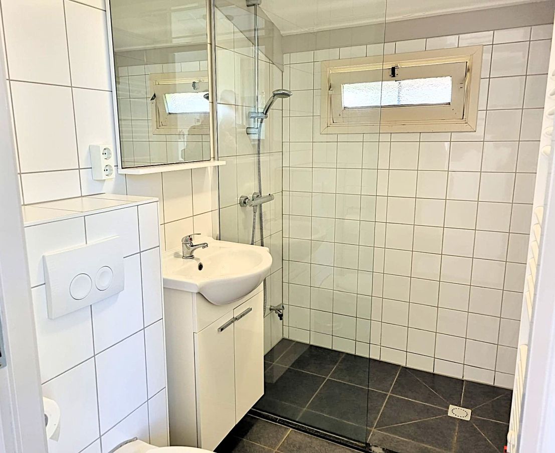 De moderne badkamer is praktisch ingericht en voorzien van een inloopdouche met glazen wand, een stijlvol wastafelmeubel met ruime wasbak, een wandcloset en een designradiator voor warme handdoeken.
